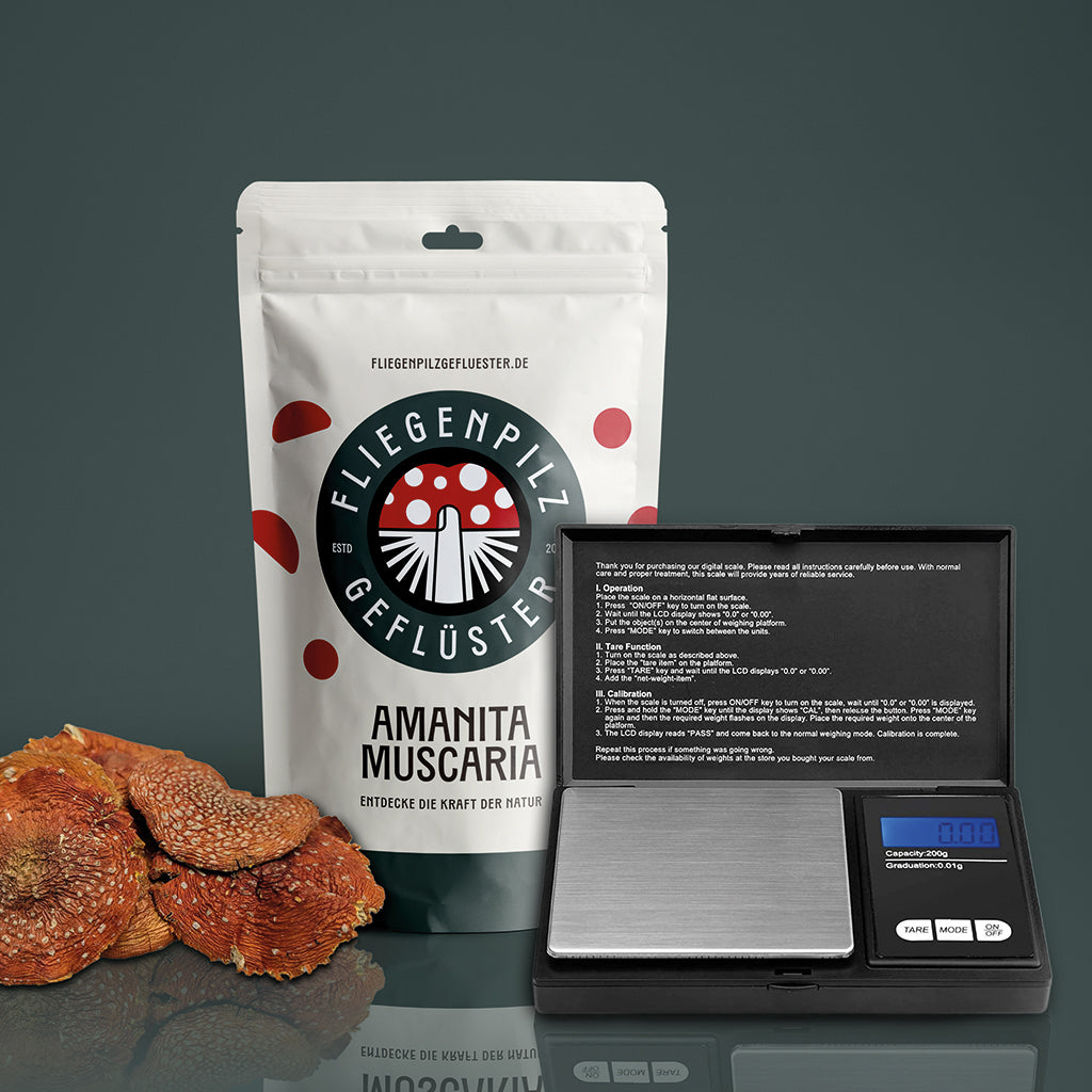 Das Starterset enthält 30 g Fliegenpilzhüte (Wert: 59,95 €) und eine praktische Feinwaage (Wert: 20,95 €).