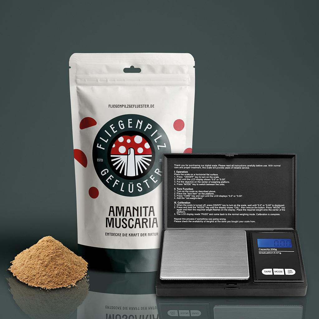 Das Starterset enthält 30 g Fliegenpilzpulver (Wert: 59,95 €) und eine praktische Feinwaage (Wert: 20,95 €).